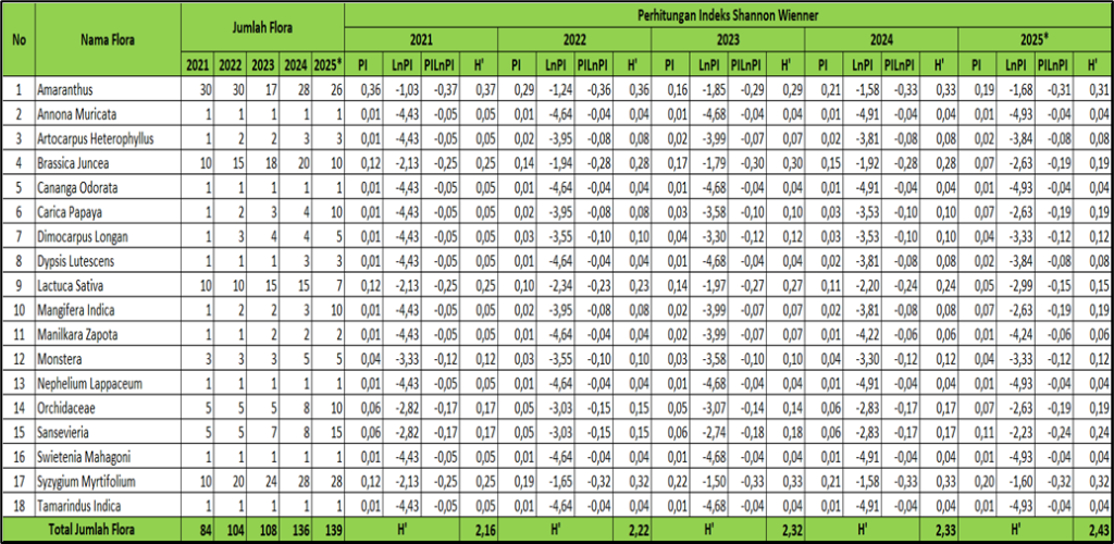 Indeks Kehati Jenis (H′ ) dihitung menggunakan rumus Shannon-Wiener sebagai berikut: